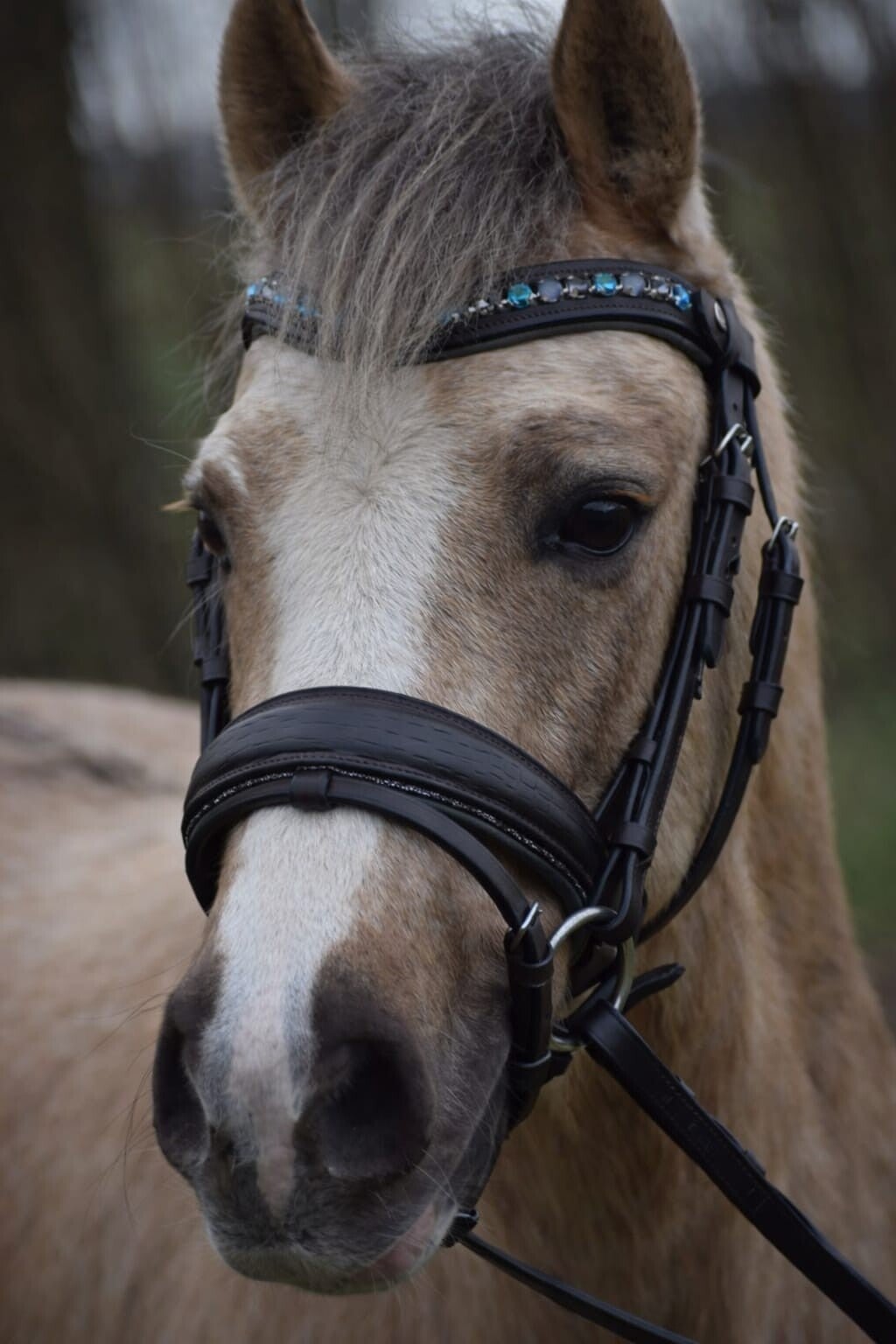 Leren bruine hoofdstel, donkergrijs onderlegd wat terug komt in de frontriem, de neusriem heeft een krokodillen print